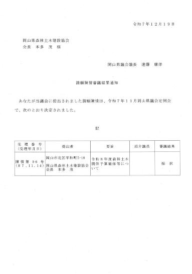 令和7年11月14日(金)に岡山県議会へ陳情した内容が採択されたとの連絡がありましたので、お知らせします。