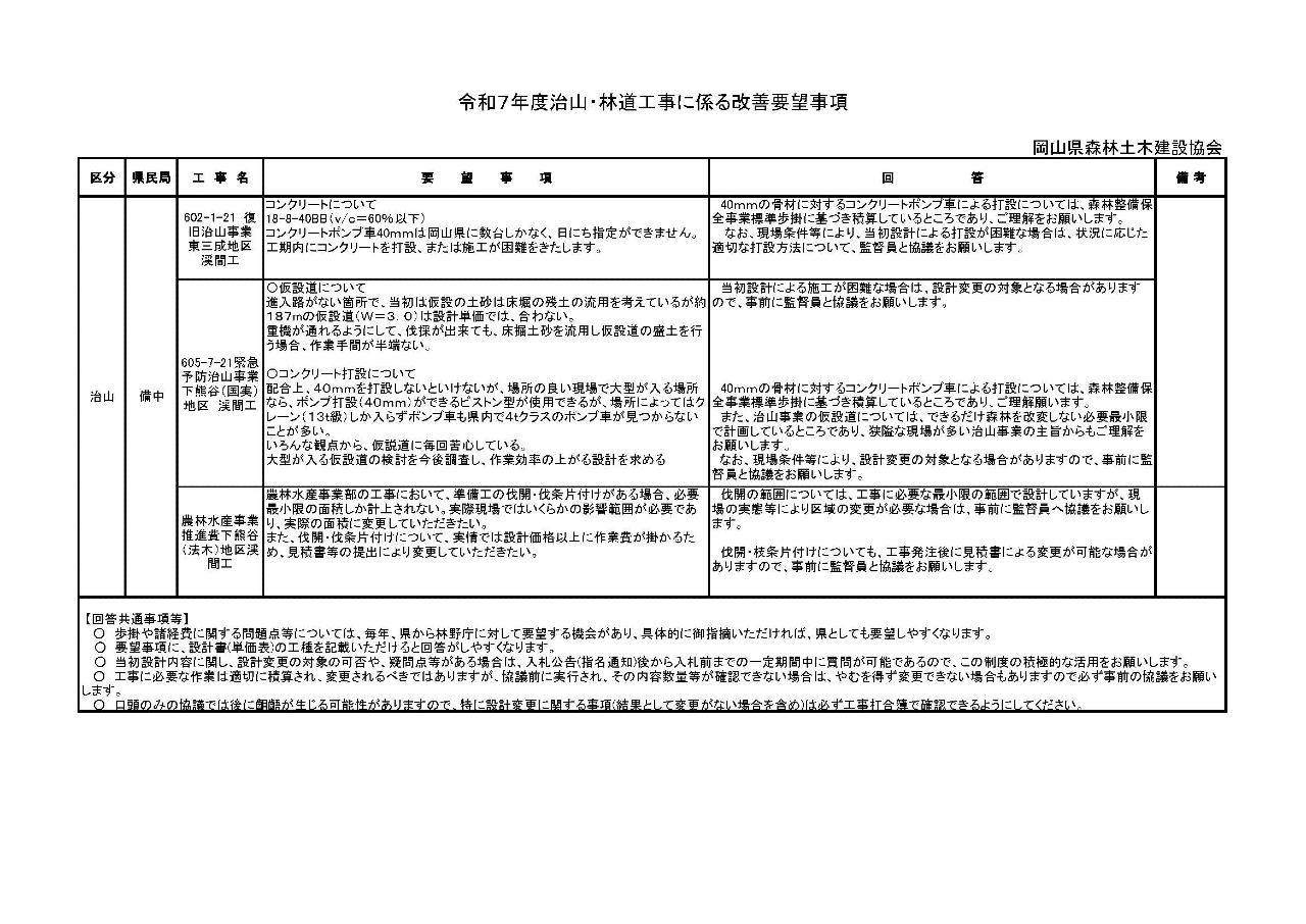 令和7年度治山・林道工事に係る改善要望事項(R6年度工事)